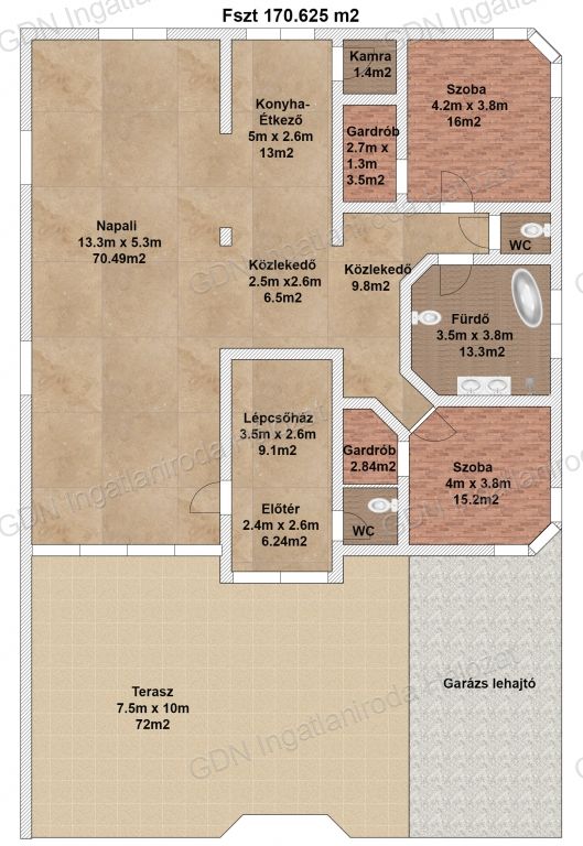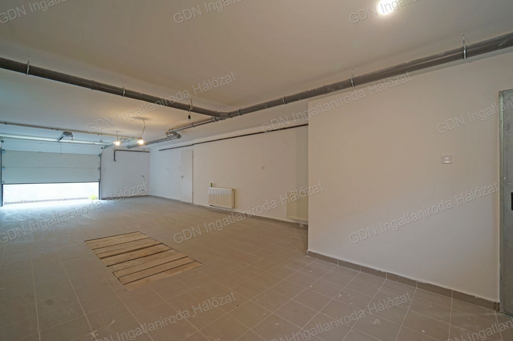Parkolás az elektromos garázsajtóval szerelt, 13.3 méter hosszú és 5.2 méter széles, 67.66m2-es garázsban lehetséges.