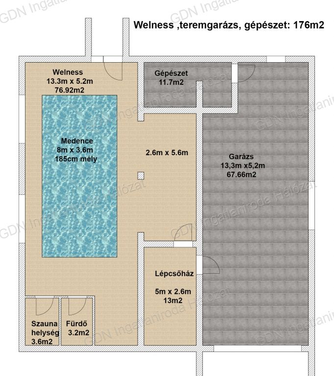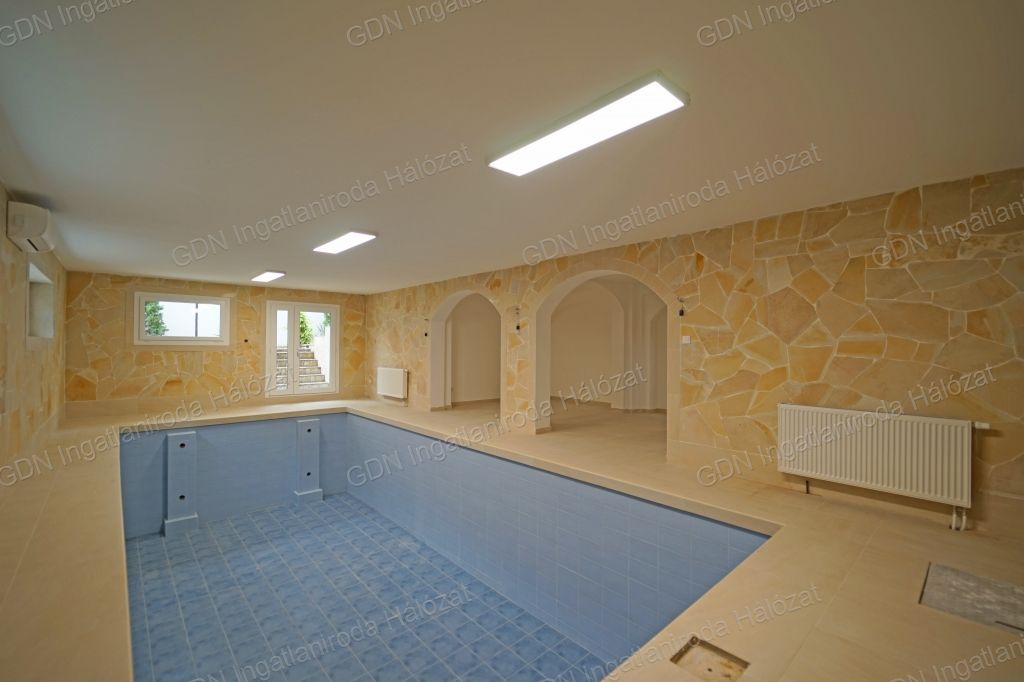 Külön kazán biztosítja a szuterén szinten elhelyezkedő 8x3,6 méteres 185 cm mély medence fűtését.