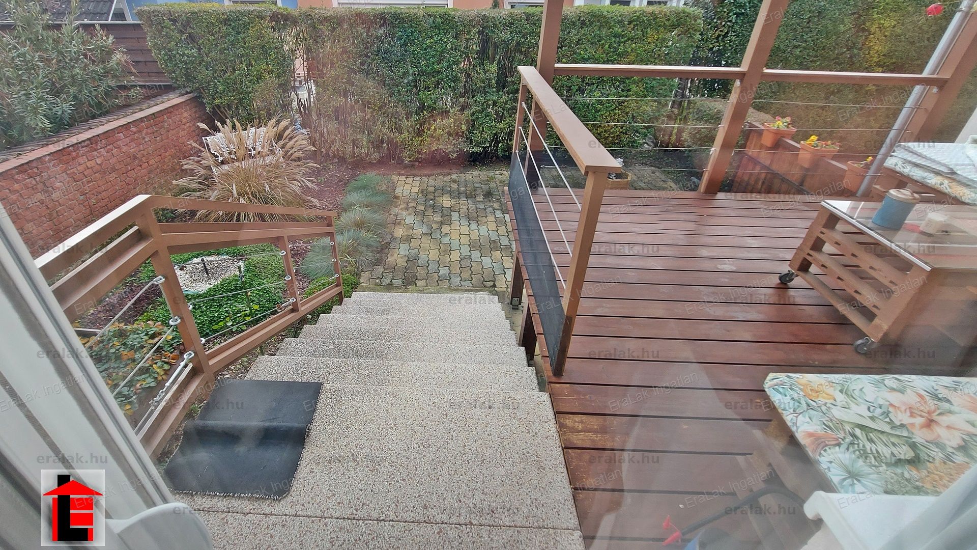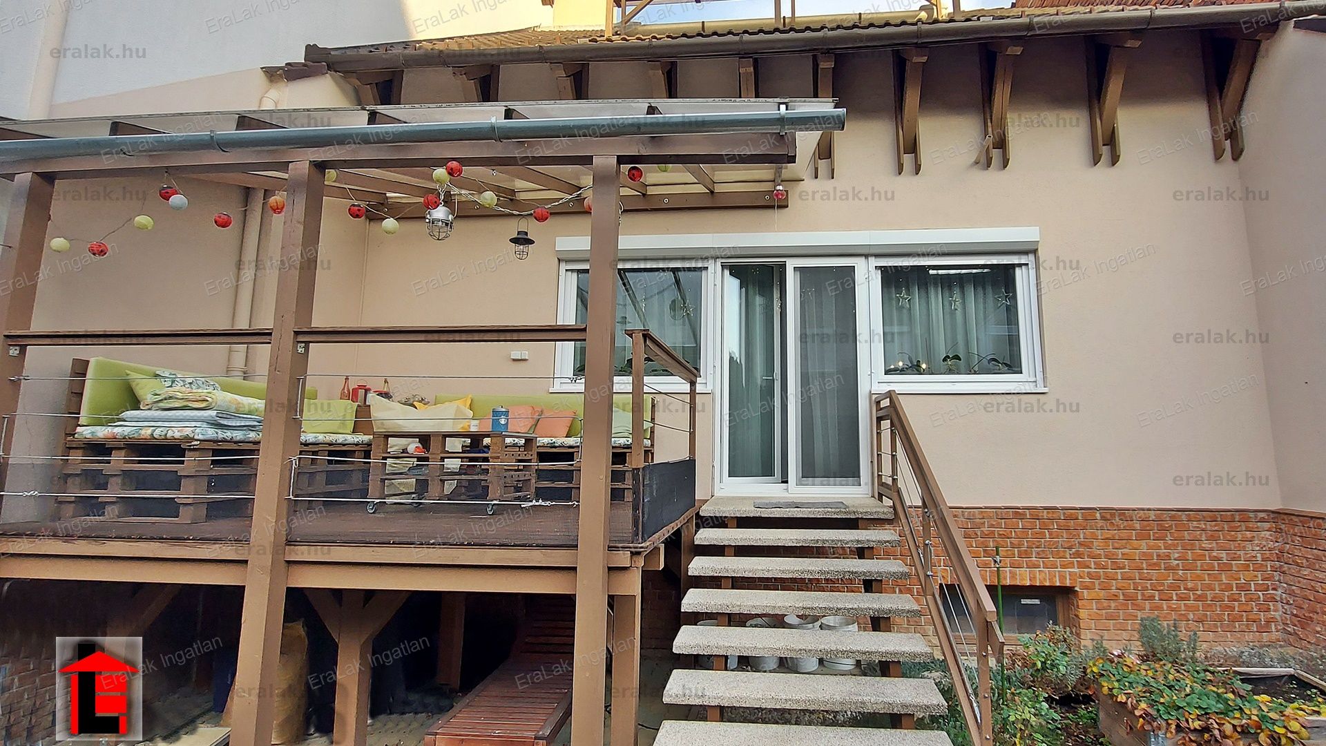 A hátsó udvar körbe kerített, kellemes, kedves, gondozott rész. Pont elég egy kis virágos-füves udvarnak...egy kis homokozónak a gyerekeknek...vagy egy kis medencés nyári kikapcsolódás helyszínéül. Itt találjuk az egyedi megoldással épített - ácsolt teraszt. A pincéből és a földszinti lakótérből is elérhető.