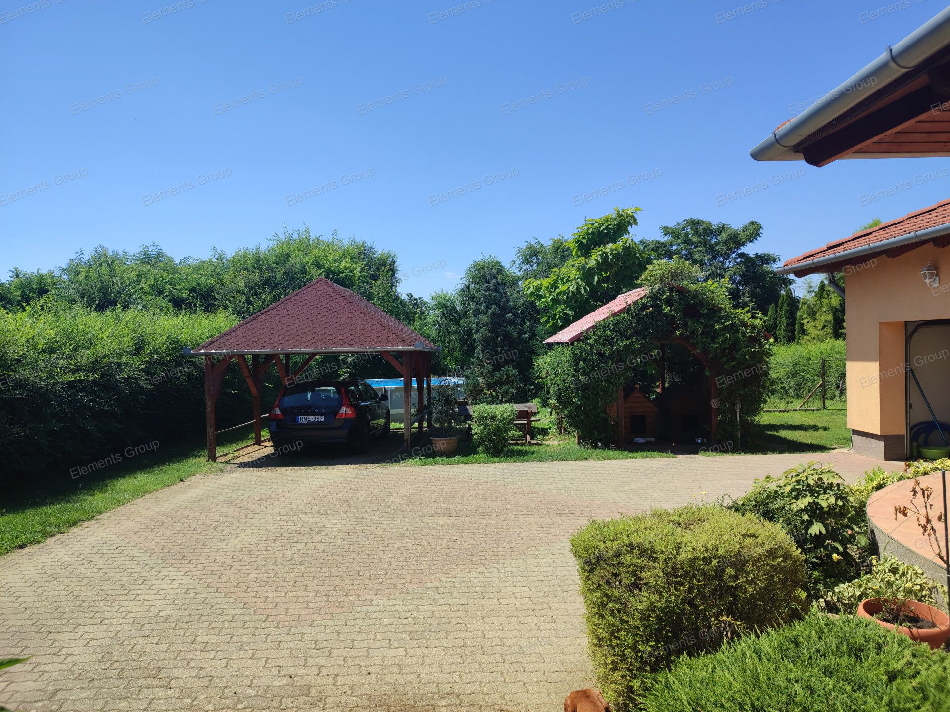 A 30 m2-es -részben fedett- terasz, a második  autó elhelyezését biztosító fedett tároló, a parkosított -öntöző rendszerrel ellátott- udvar a lakók kényelmét szolgálja.