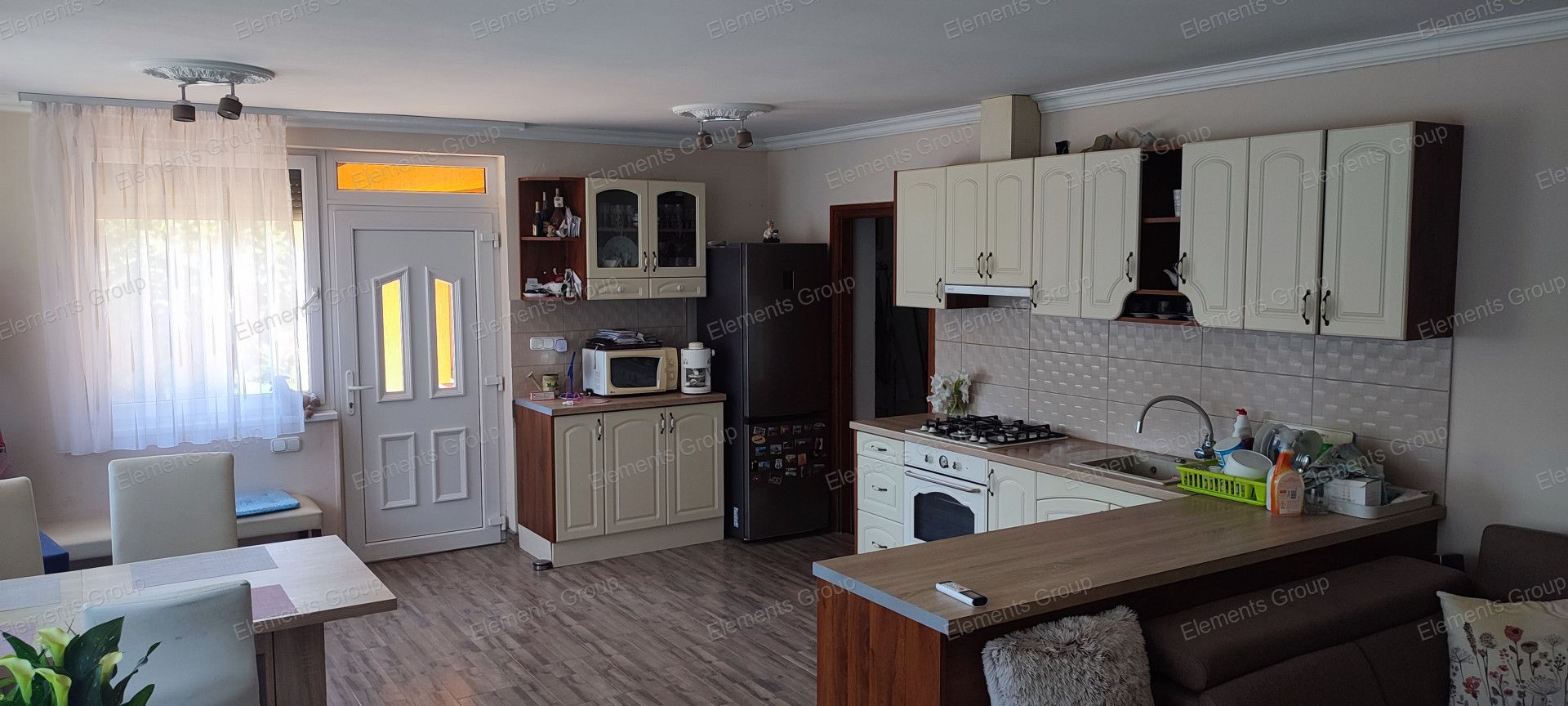 2 meglepöen nagyméretű hálószoba (12,6 ill. 14,4 m2) és 40 m2 amerikai konyhás nappali mellett szintén kellően tágas mosókonyha, spájz és külön fürdőszoba-wc található a házban, mely 2 bejáraton közelíthető meg.