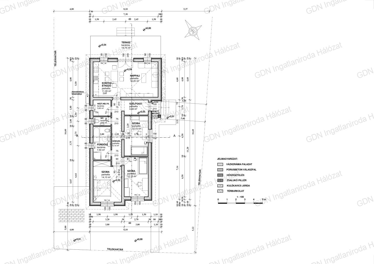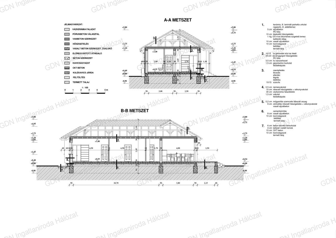 A tartószerkezeti falak Porotherm P30N+F téglából, betonkoszorúval, fa födémes tetőszerkezettel készülnek. A lábazat 10 cm polisztirol lépésálló, a homlokzatok 10cm-es Austrotherm Grafitos, a vízszintes födém 25 cm ásványgyapot szigeteléssel lesz ellátva.