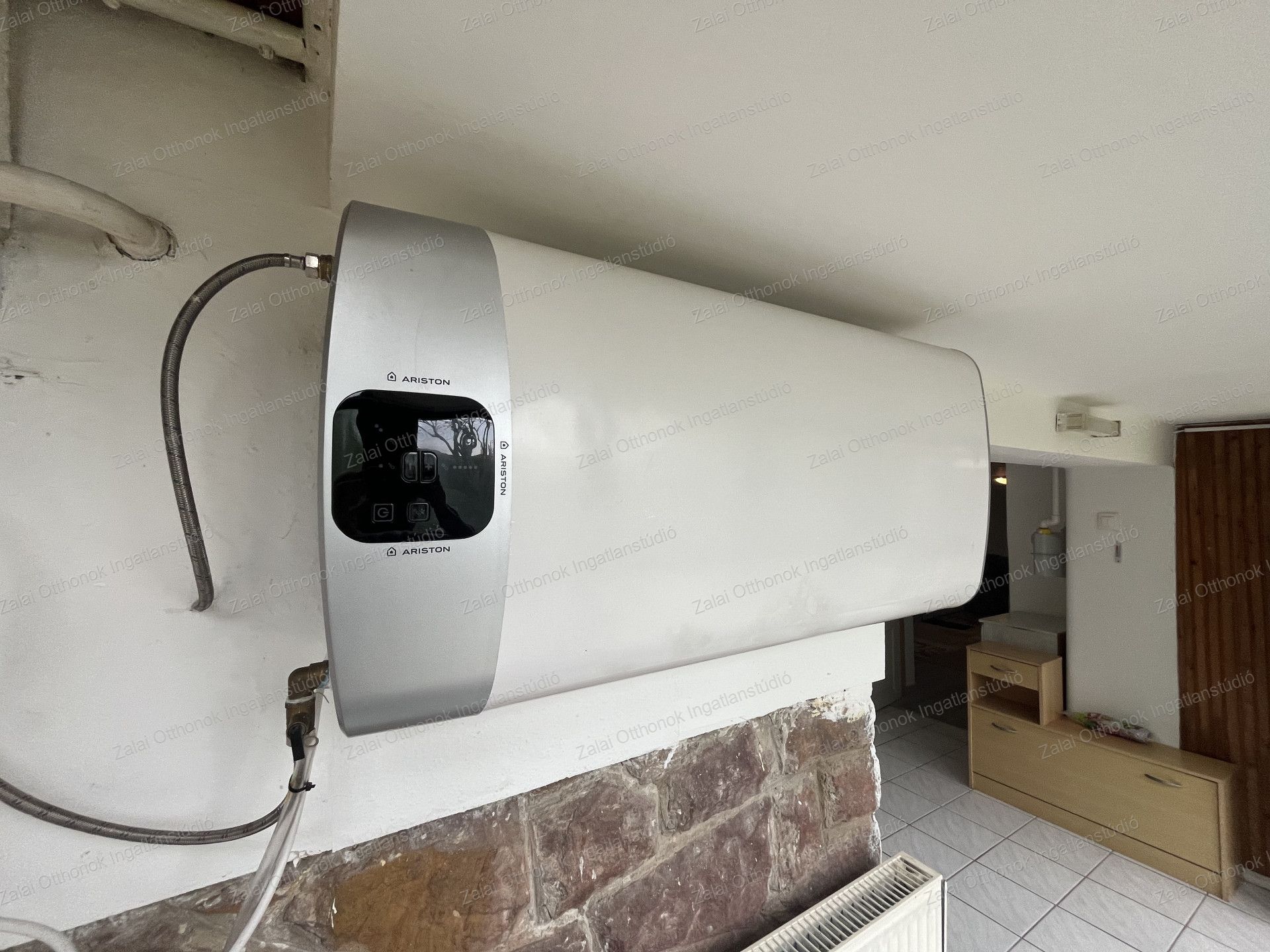 Fűtése, 2024-ben beüzemelt Immergas gázkazánnal lehetséges, a melegvizet villanybojler szolgáltatja vezérelt árammal.