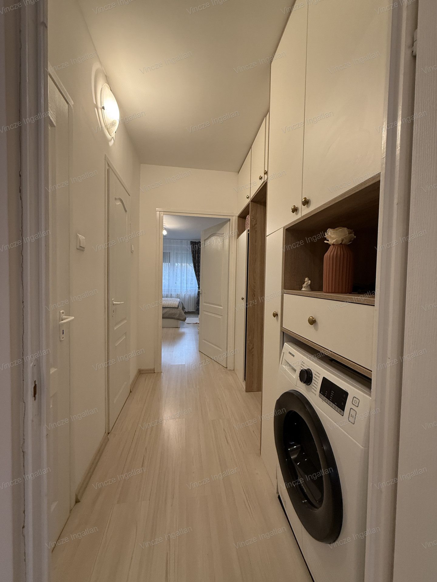 A lakás különlegessége a sok-sok praktikus, egyedi beépített szekrény, amelyek jelentős értéket képviselnek, és természetesen mind maradnak.