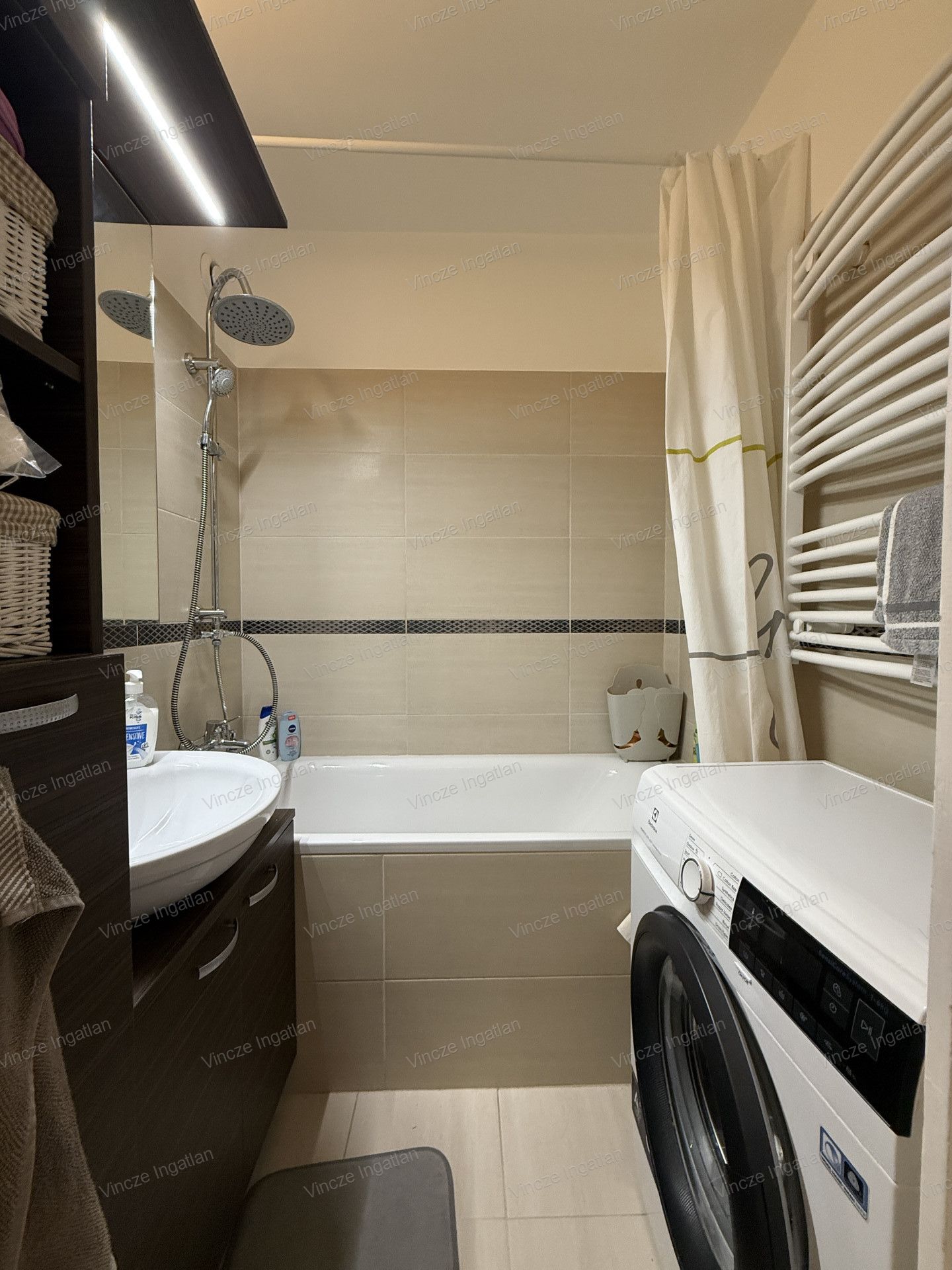 A fürdőszoba is igényesen megálmodott, kádas, szép, harmonikus.