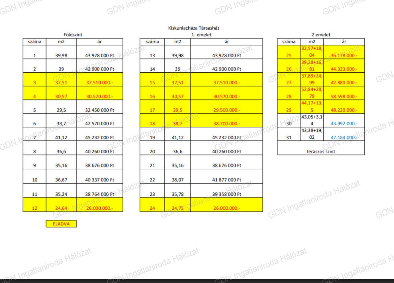 Kiskunlacháza központi részén, kínálom megvételre új-építésű 31 lakásos liftes társasház, első emeleti 35,16 nm-es lakását! Kiskunlacházán most épülő társasház első emelet 21-es. lakása eladó! A társasházban 31 db lakás épül 27 és 54 nm között három szinten, lakások 2025 második felében kerülnek átadásra. Nézze meg a többi lakást is a hirdetésem között! Műszaki tartalom: -alap vasalt beton, -falazat phorothetm tégla -monolit beton födém -nyílászáró 3rtg üvegezett műanyag szerkezetű -tető fedése beton cserép -fűtés hőszivattyú, padlófűtés hőleadással -15 cm Dryvit rendszerű homlokzatszigetelés -választható hideg és meleg burkolat. A lakás 35,16 nm, helyiségei:előtér 3,78 nm, fürdőszoba 4,89 nm, étkező/konyha 10,17 nm, nappali/lakószoba 16,32 nm. A lakáshoz vásárolható teremgarázshely melynek ára 3.500.000 ft, vagy földfelszíni parkolóhely melynek ára 1.500.000 ft, (megvásárlása nem kötelező), valamint tároló helyiség is vásárolható. A társasházban 31 db lakás kerül megépítésre, a földszinti és első emeleti lakások erkély nélküliek, a 2 emeleti lakások terasz kapcsolattal rendelkeznek. Amennyiben kérdése merül fel, vagy megtekintené a lakást keressen bizalommal! FINANSZÍROZÁS: Nálunk mindent egy helyen intézhet: - hivatalos ingatlanközvetítés; - szakszerű jogi képviselet; - profi CSOK-PLUSZ, és hitelügyintézés: 16 Bank, több mint 100 konstrukció; A részletes adatvédelmi tájékoztató folyamatosan elérhető a gdn-ingatlan adatvedelmi oldalon.