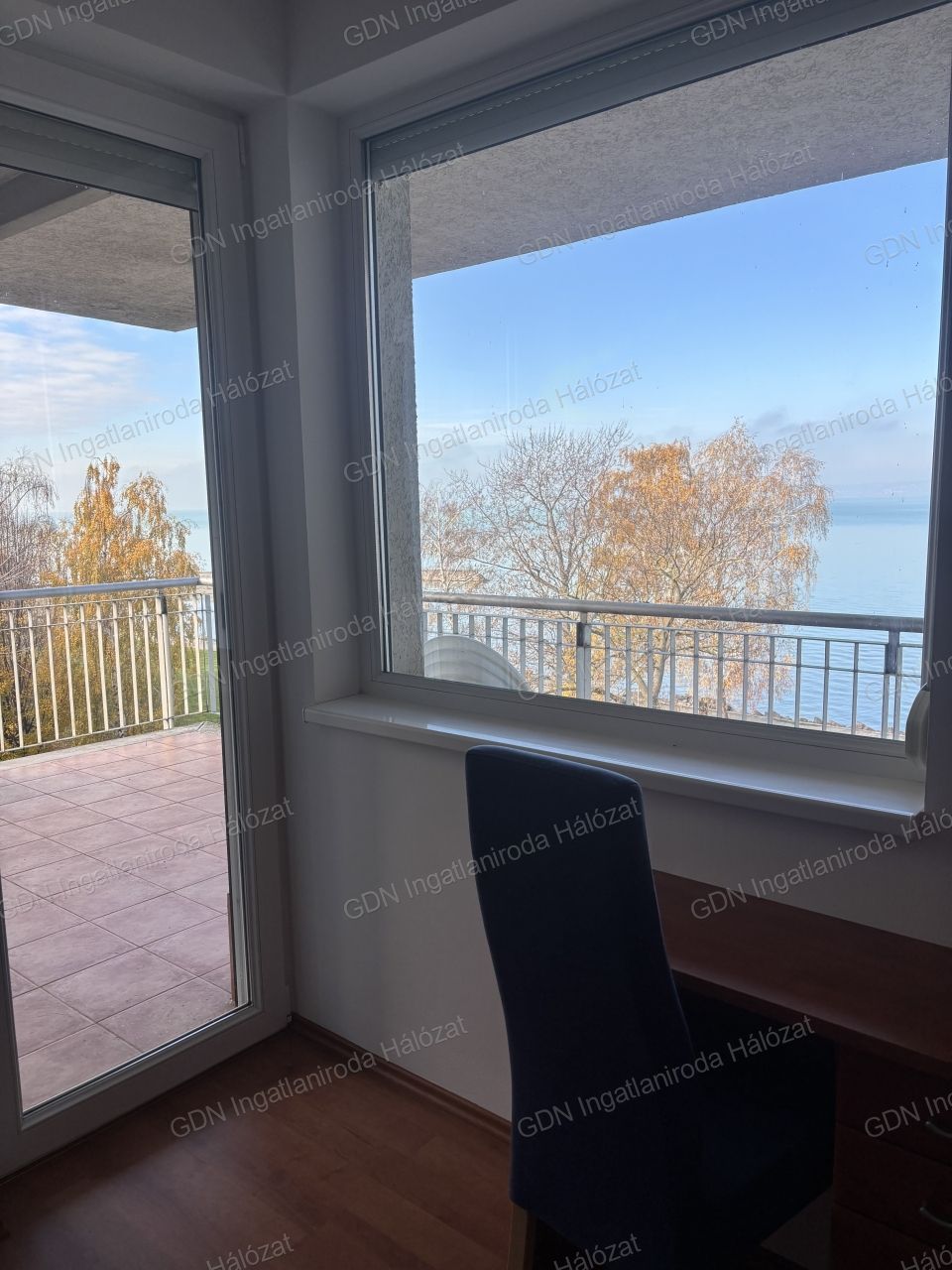 A 16 nm-es terasz fedett, örök panorámás a Balatonra.