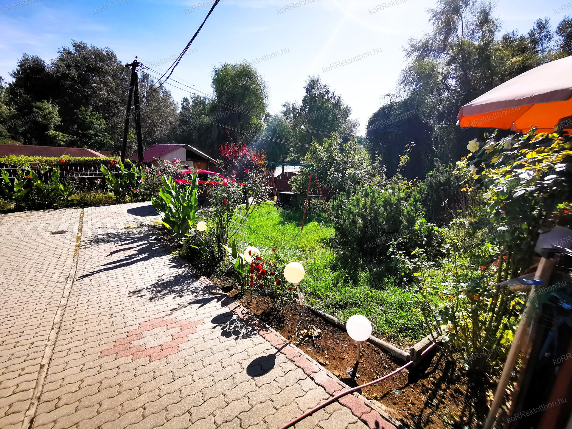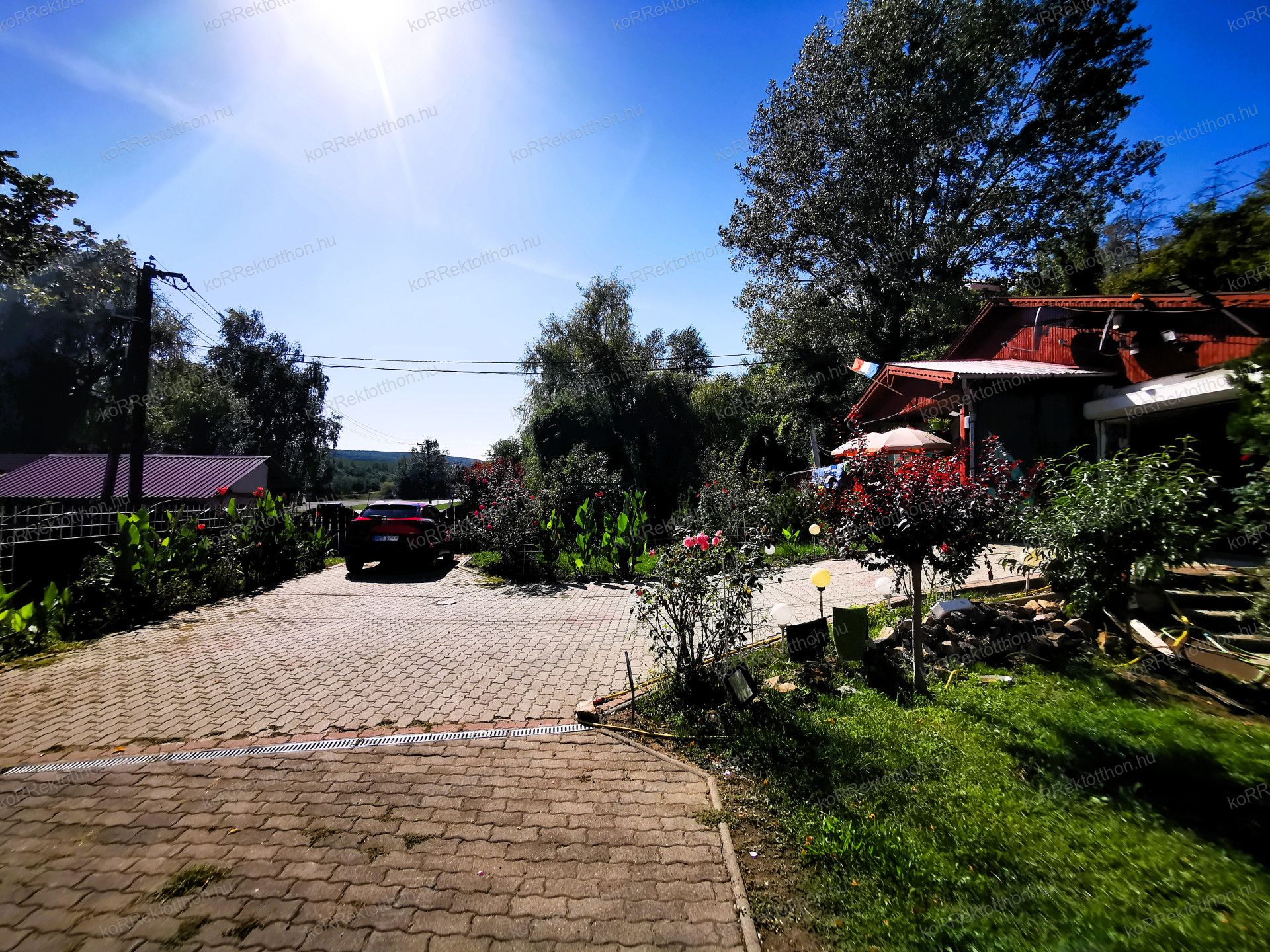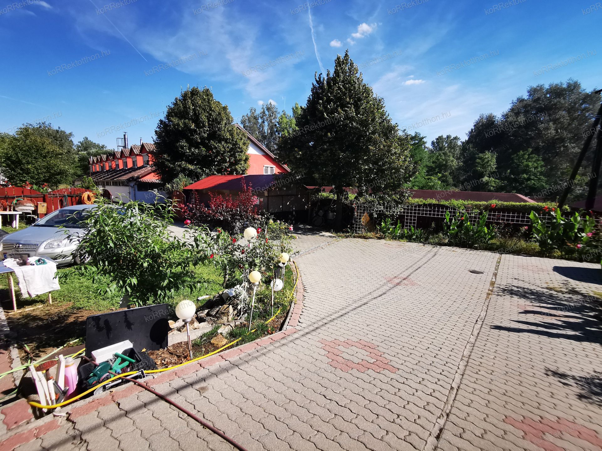 Hangulatos, térköves udvar, virágos környezet