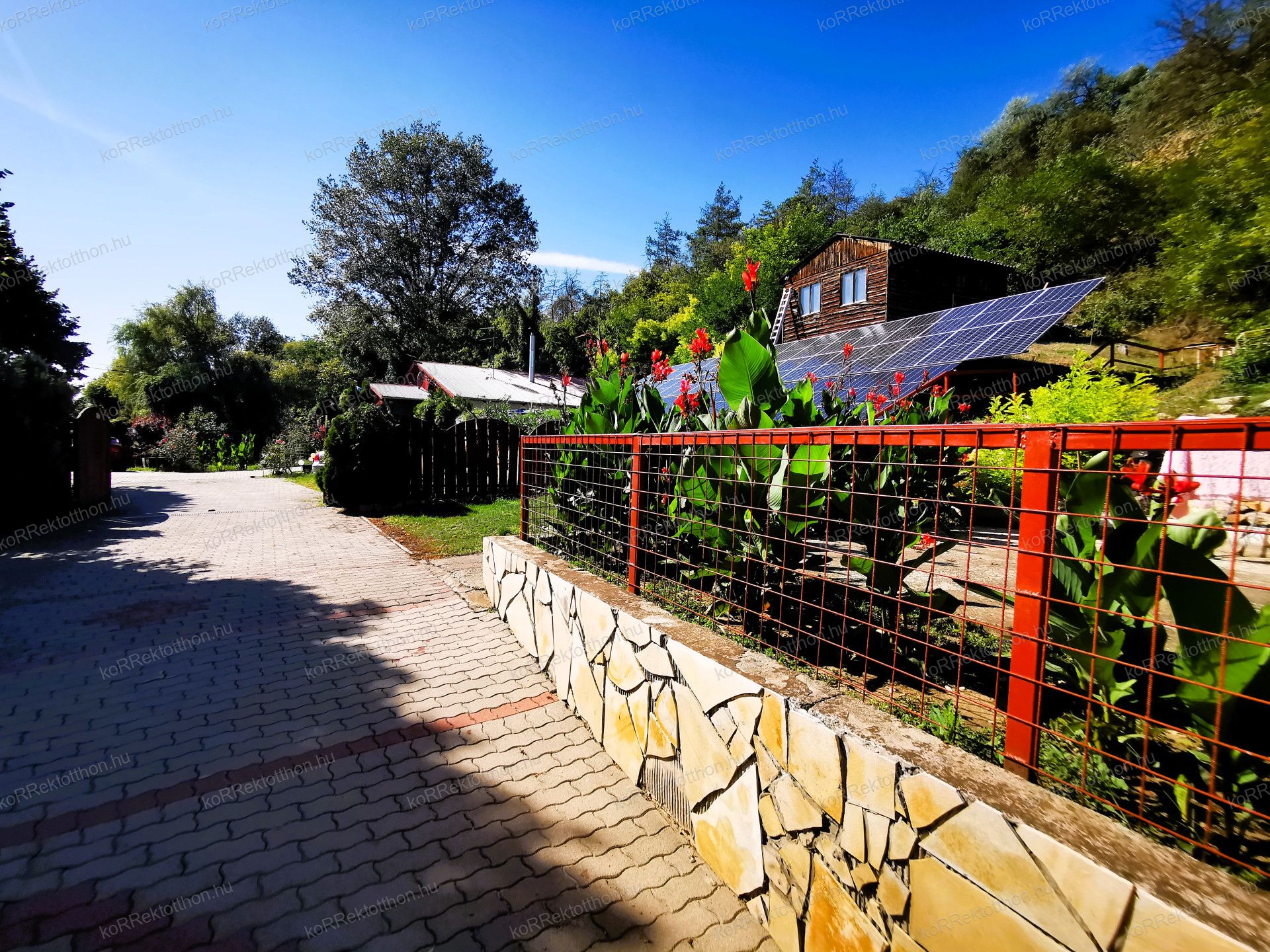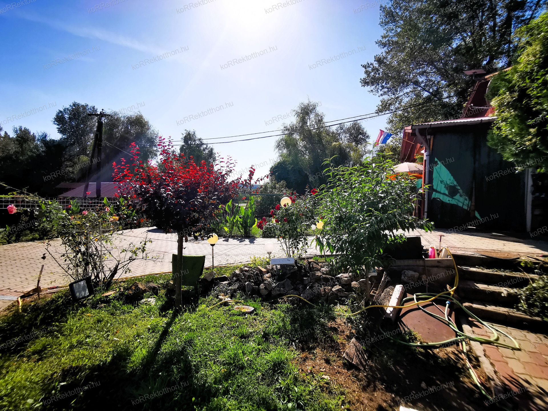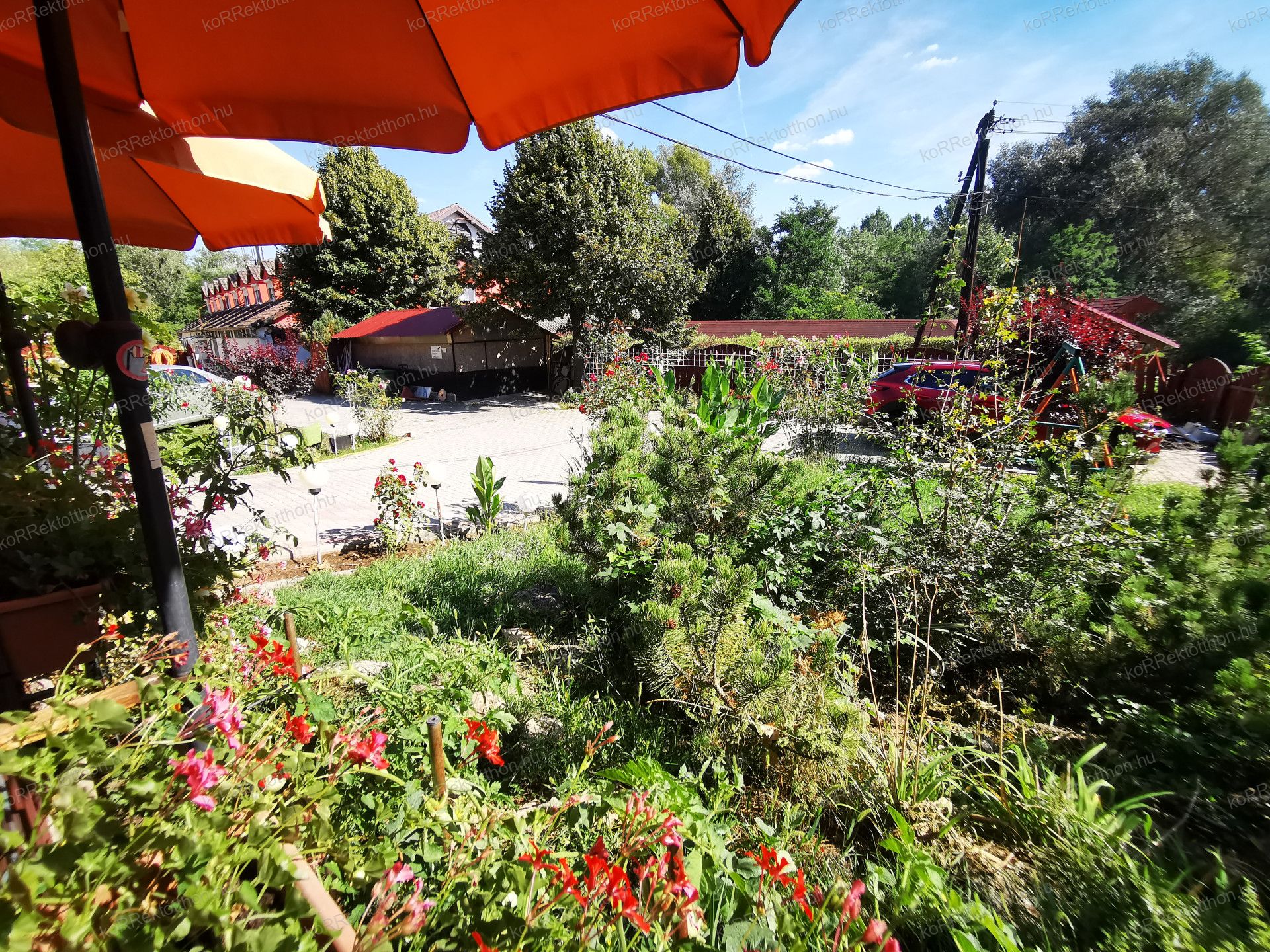 Hangulatos, térköves udvar, virágos környezet
